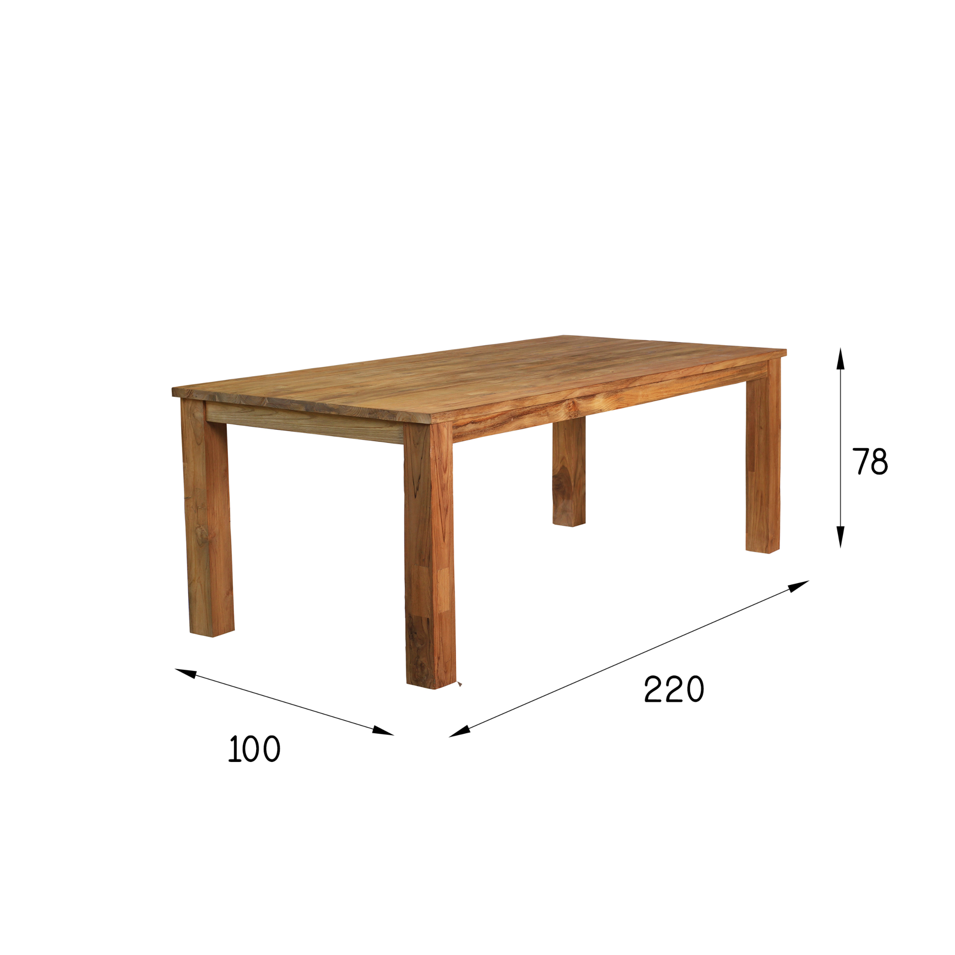 Doğal teak malzemenin sağlamlığı ve şıklığıyla tasarlanan bu 220 cm masa, geniş yüzeyiyle hem iç hem dış mekan kullanımları için mükemmel bir seçenektir.