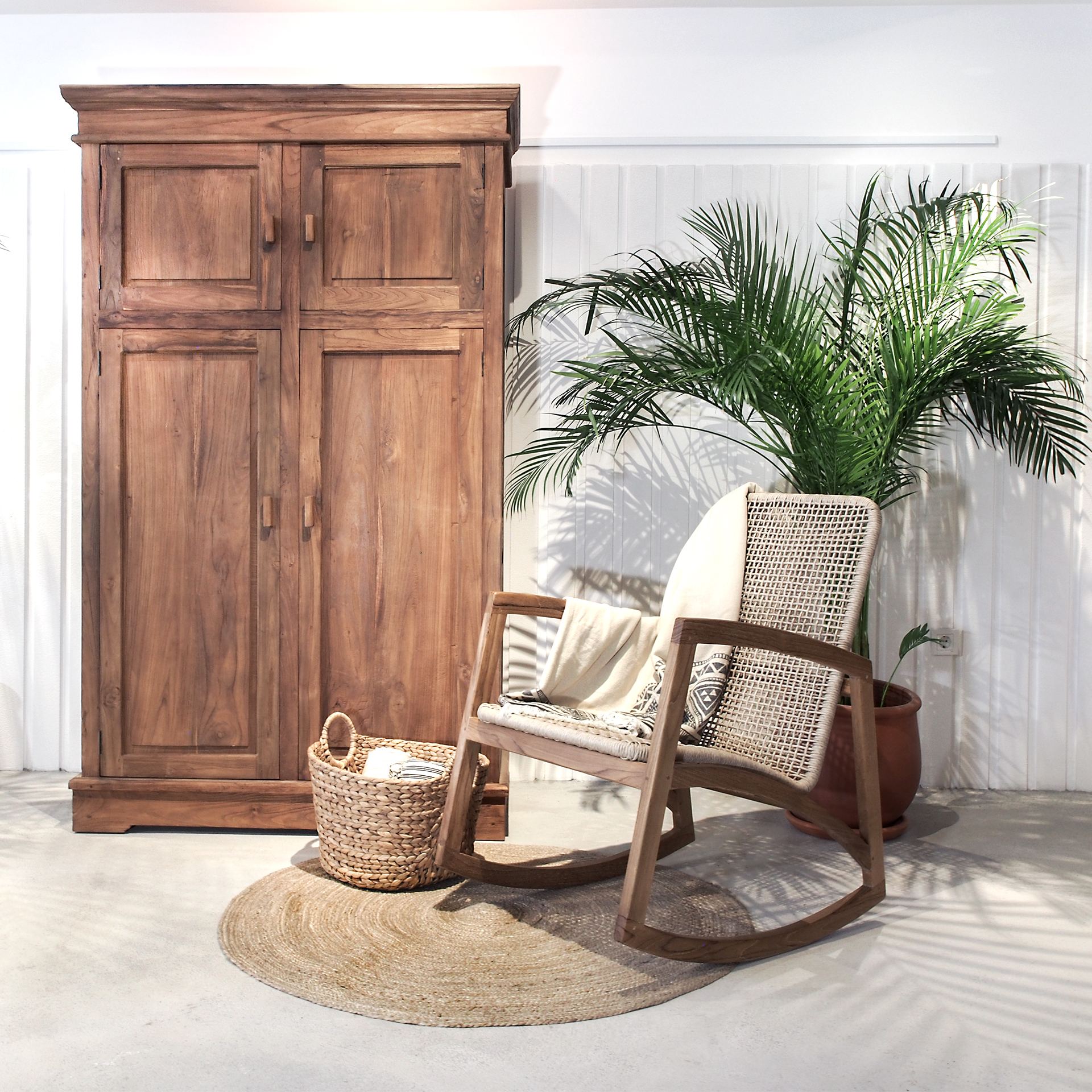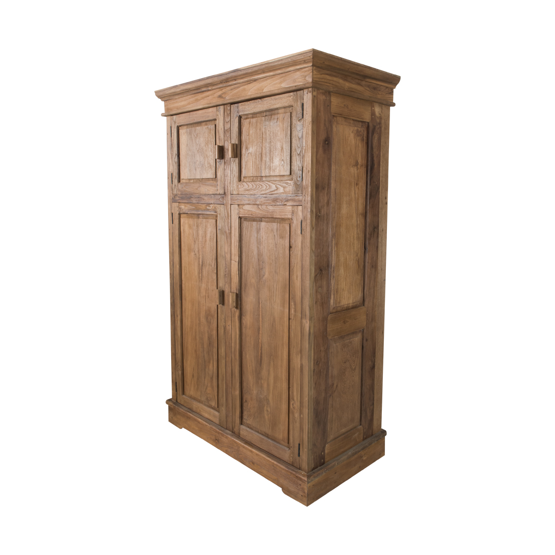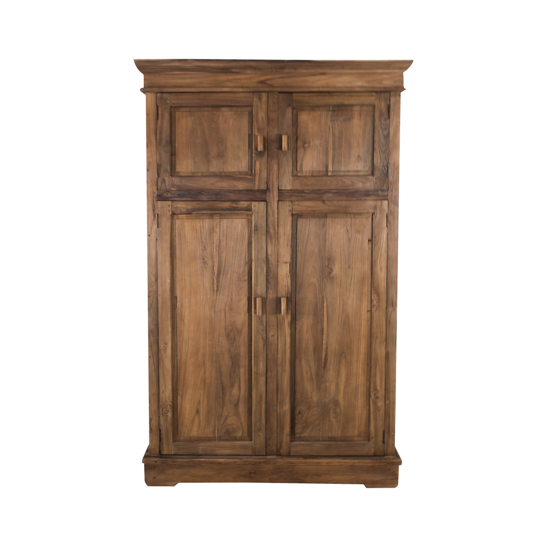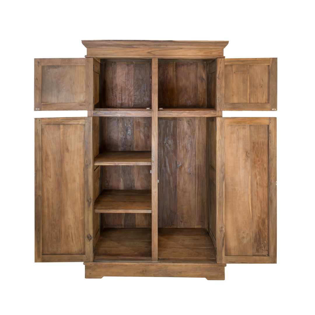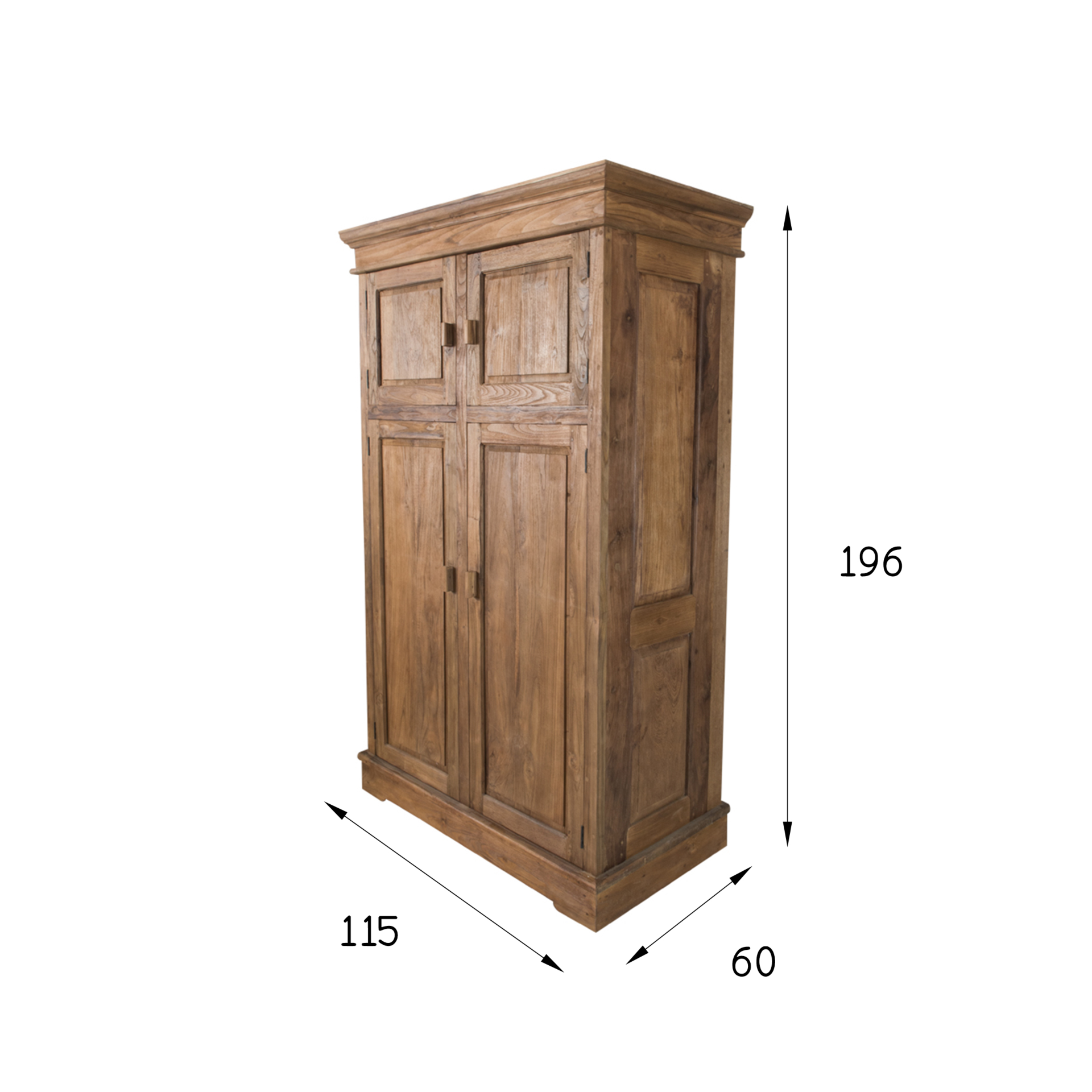 Zarif ve dayanıklı bir tasarım olan bu boydan gardrop, saf teak ağacından özenle imal edilmiştir. Üst kısmında bulunan iki kısa kapak kullanımı kolaylaştırırken, alt kısmındaki iki uzun boydan kapak geniş depolama alanı sunar. Doğal teak dokusu mekanınıza sıcak dokunuş katarak, şıklığı ve işlevselliği bir araya getirir.