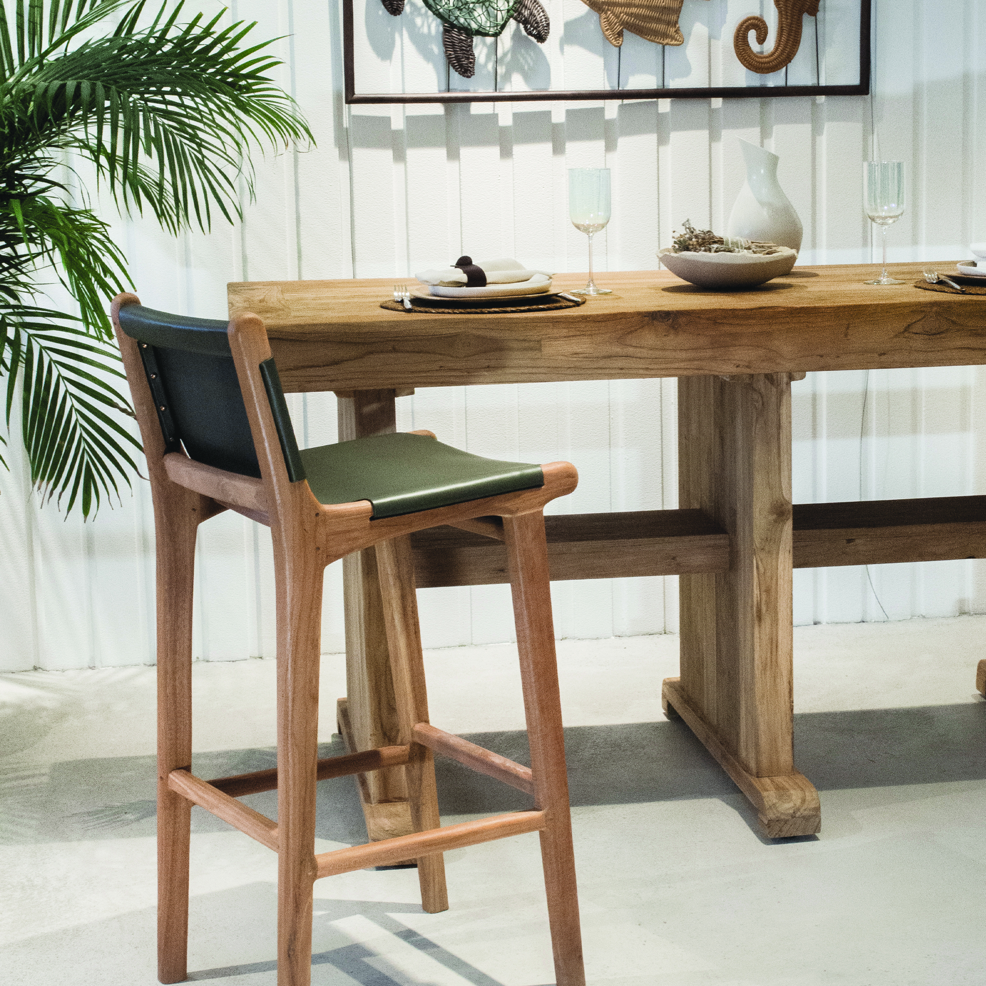Linz Bar Taburesi Olive, teak ağacının zarif işçiliğini deri oturum detayıyla birleştirerek konforlu ve şık bir oturma alanı sunar. Sade tasarımıyla her mekâna uyum sağlar ve uzun süreli kullanım için dayanıklı bir yapıya sahiptir. Modern ve rustik dekorasyon tarzlarını tamamlayan bu bar taburesi, hem estetik hem de işlevsel bir seçimdir