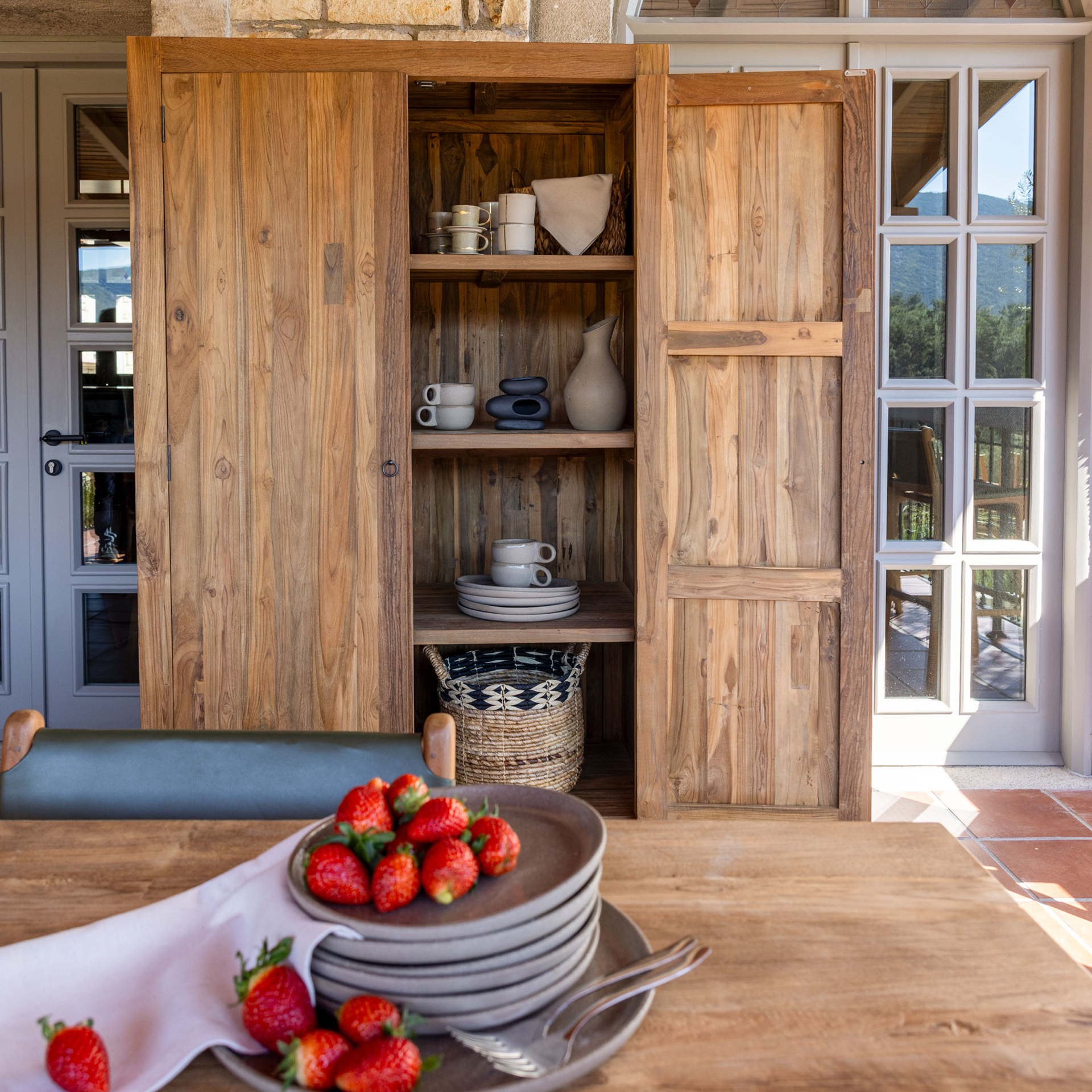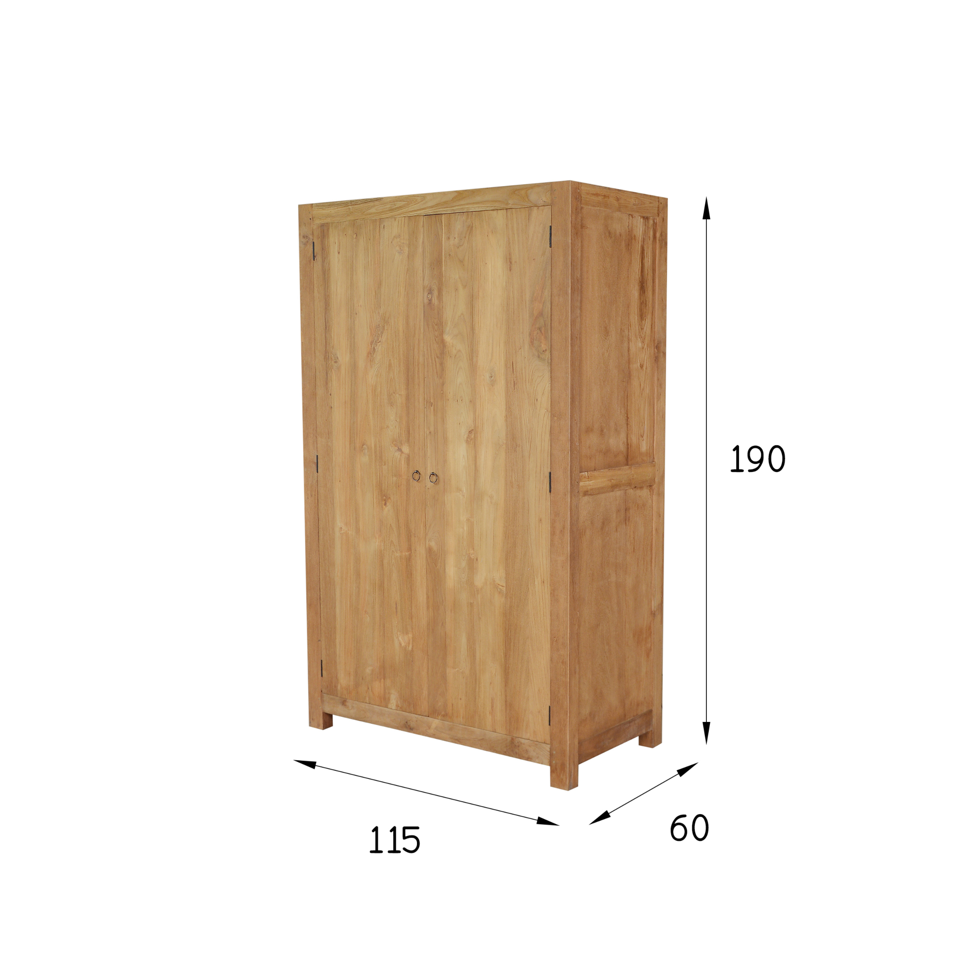 190 cm yüksekliğindeki bu dolap, doğal teak gövdesi, metal kulpları ve iki kapaklı raflı yapısıyla hem şıklık hem de işlevsellik sunar. Zamansız tasarımıyla her mekâna sıcak bir karakter katar.